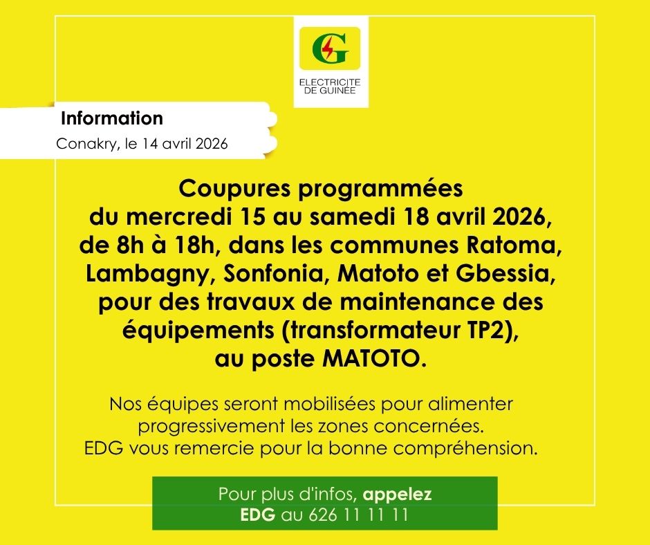 Dans le cadre de l’amélioration de la desserte, les équipes EDG et CWE effectueront des travaux d’entretien préventif des équipements au poste Matoto.